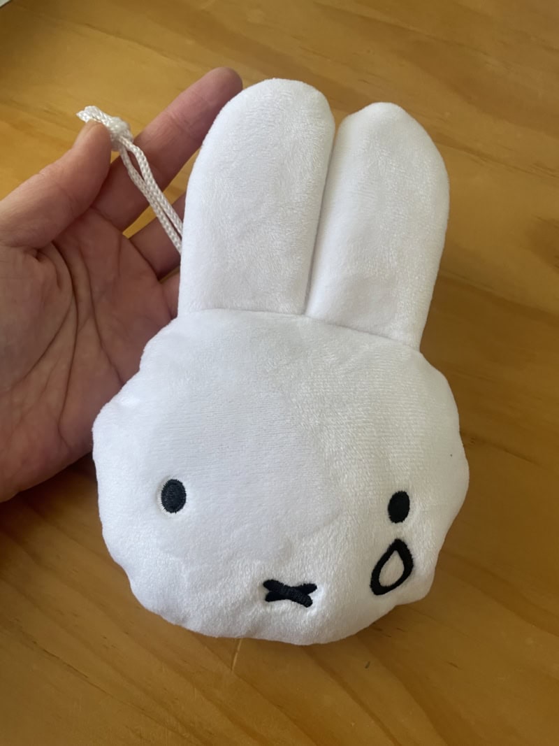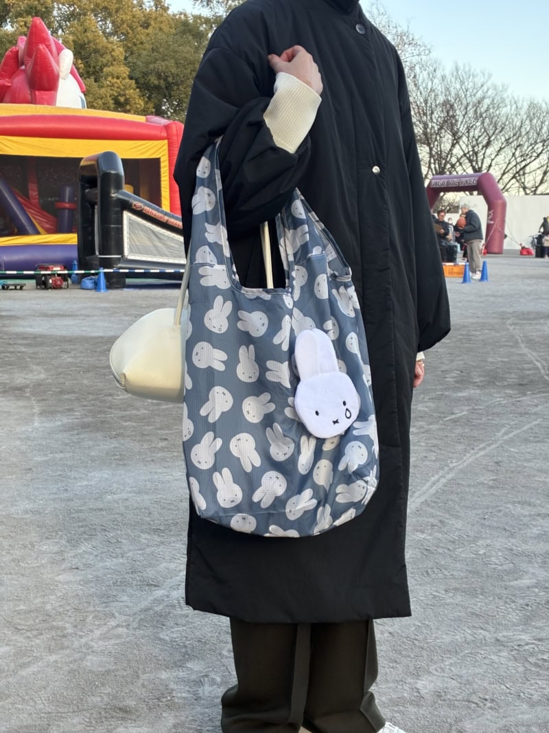スーパーへの買い出しに大活躍のエコバッグ。くすみブルー地にオリジナルデザインの総柄がプリントされた、ちょっぴり大人仕様なんです。表面に付いている、ミッフィーのふわふわフェイスがたまらない♡