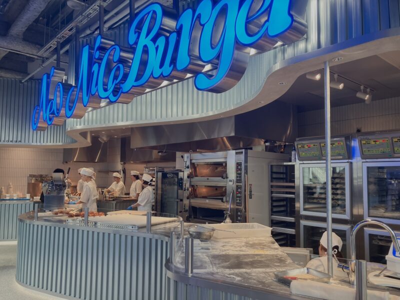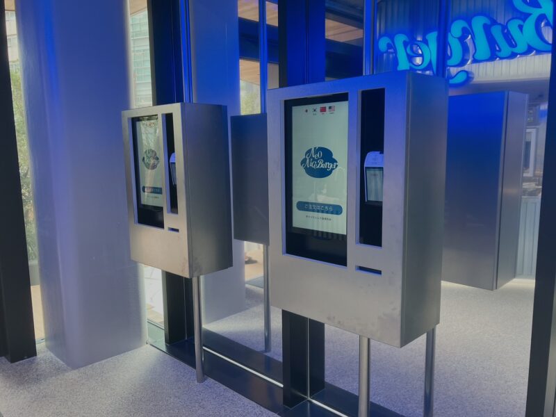 1Fにある「ネオナイスバーガー」はブランドカラーの青と白を取り入れ、ステンレスを基調としたシンプルでスタイリッシュな雰囲気。ネオンブルーのロゴが印象的で、未来的なニュアンスも感じられます♪