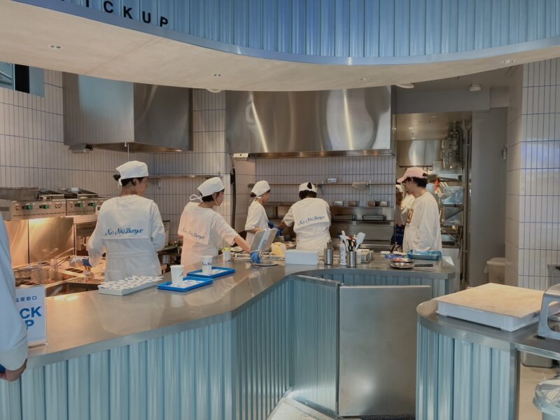 パテを焼いたり、バーガーに具材をセットしたり、キッチンの様子が見えます