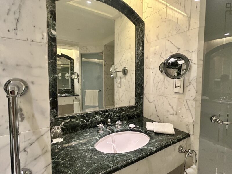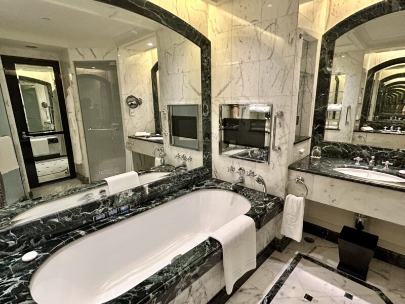 大理石を贅沢に使用した優雅なバスルームにも驚きました。広々とした空間はクラシックな美しさにあふれており、とても優雅な雰囲気です。この豪華なバスルームで過ごす時間は、日常を忘れさせてくれる至福のひとときでした。