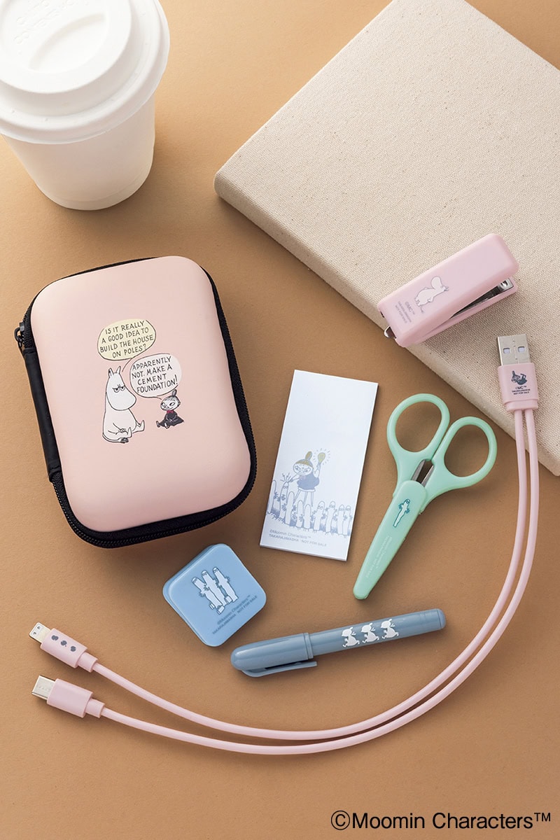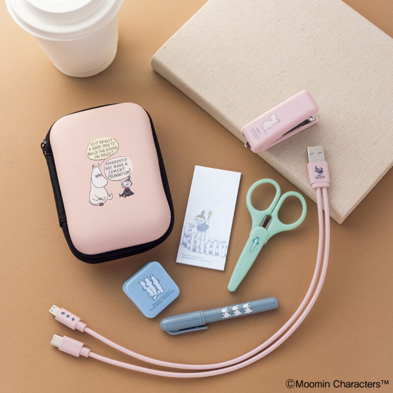 ムーミンと仲間たちがデザインされた、可愛らしい文具セットが登場。ボールペン、はさみ、クリップ、USBケーブル、ふせん、ステープラー、そして軽くて丈夫なケースがセットになっています。コンパクトな手のひらサイズなので、持ち歩きにも便利。日々の生活や仕事に活用して!