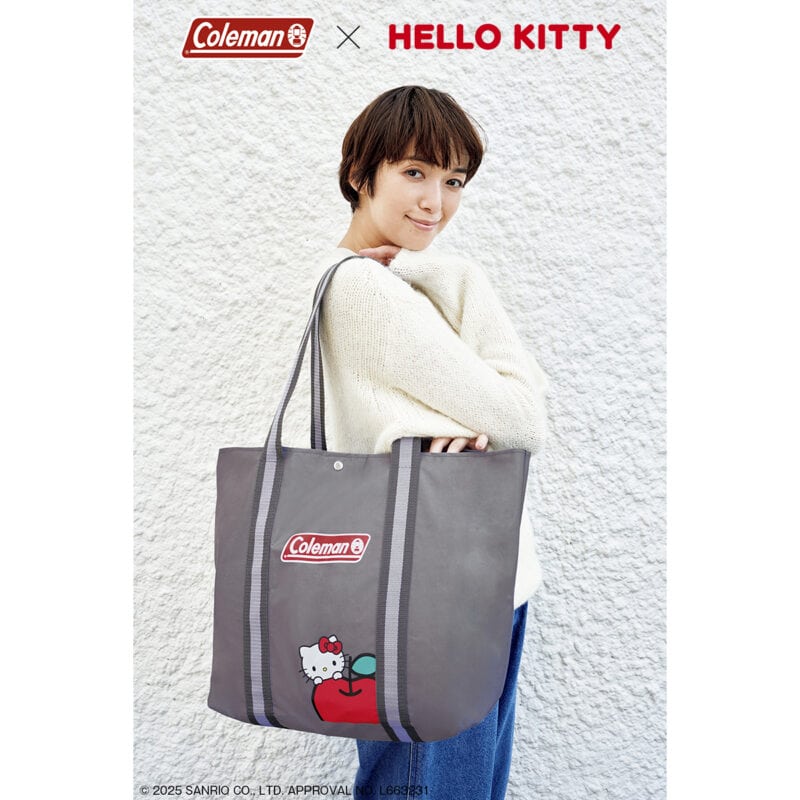 赤いりんごにつかまる愛らしいハローキティとコールマンの赤ロゴがアクセントになったトートバッグは持つだけで気分がアガる!ニット¥18,700(サロン アダム エ ロペ) パンツ¥29,920(オブラダ/シンチ)