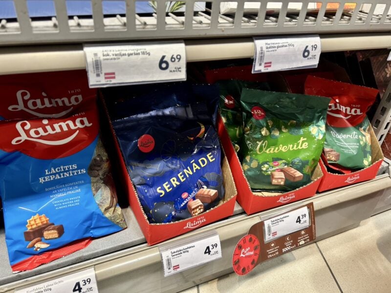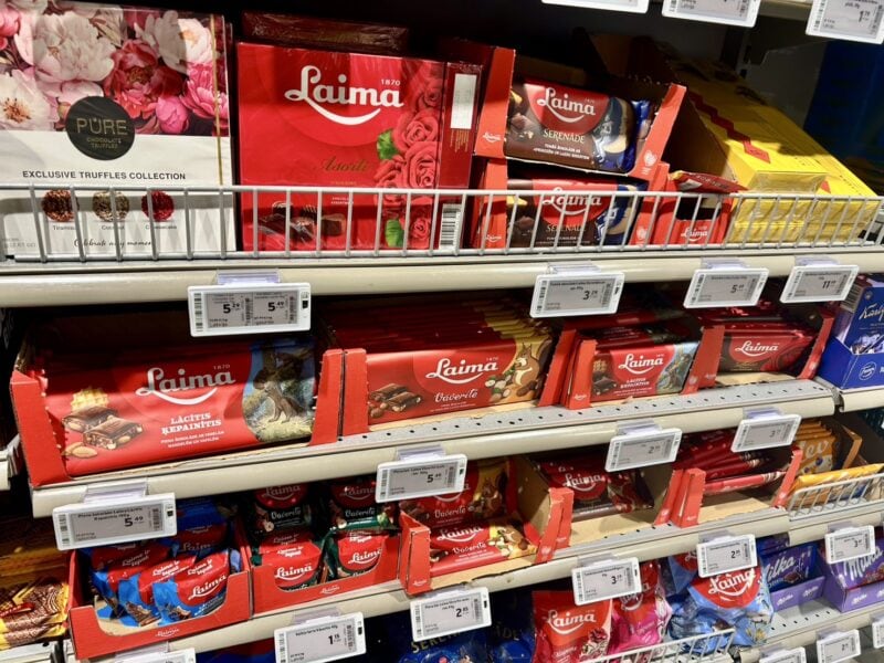 まずチェックしておきたいのが、ラトビアの老舗チョコレートブランド「Laima」(ライマ)です。1870年にラトビアの首都・リガで創業された、非常に歴史あるチョコレート会社によるブランドで、お土産としてはもちろん、現地での国民的なお菓子として広く親しまれています。スーパーでも多様な種類のライマを見つけました。