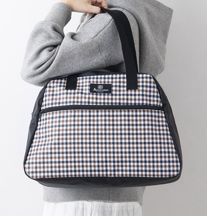 『GLOW』3月号付録は、創設175周年を迎える歴史あるモダン・ブリティッシュブランド【アクアスキュータム】の大容量ボストンバッグ。アクアスキュータムクレストロゴの織ネーム付き!クラブチェックをあしらった洗練されたデザインです。