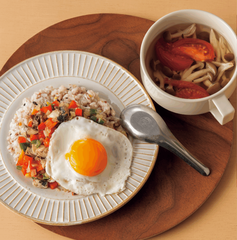 3.サバ缶を加えてほぐし、炒め合わせる。仕上げにしょうゆを加えて混ぜ合わせ、雑穀ごはんとともに器に盛り、目玉焼きをのせる。