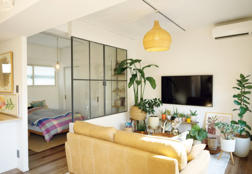 「キッチンは外向きに作ってもらい、セラミック製のフルフラットに。元の窓を、リビングとベッドルームをセパレートする仕切りとして活用しています。ほどよく工業的なエッセンスが加わって、気に入っています」とKiiさん。インテリアは、木製のものとグリーンを取り入れて、ナチュラルな雰囲気に。ほっこりしすぎないように、アートやファブリック、植物のポットなどで、適宜色を入れてアクセントにしています。帰るのが楽しくなるような、心地よさが魅力のお部屋です。