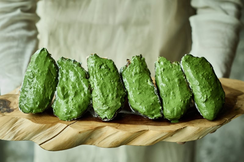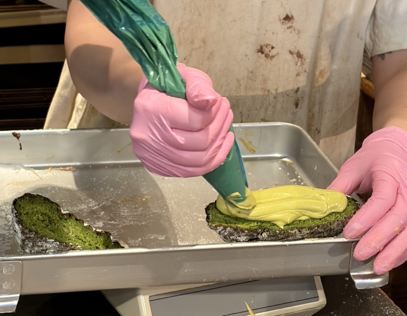 抹茶ディプロマットクリームをたっぷりとのせて