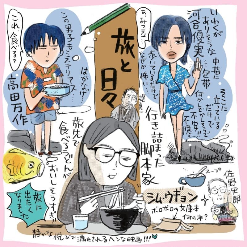『旅と日々』を要約してみよう。日本映画。監督と脚本は三宅唱。原作はつげ義春の漫画2作、前半は「海辺の叙景」、後半は「ほんやら洞のべんさん」で構成。主演はシム・ウンギョン、韓国出身の映画脚本家を演じる。けれど彼女が主人公かと言えばちょっと違うし、何が起きるか、物語のトピックは何かと整理すると貧弱で、何も伝わりそうにない。要約に不向き、それはいい映画の条件だ。
